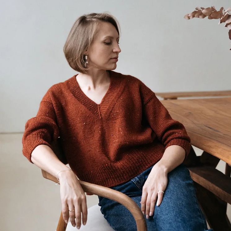 Пуловер свободной посадки с V-образным вырезом и японским плечом вяжется сверху вниз лицевой гладью. Текстовое описание сопровождается видео-подсказками.